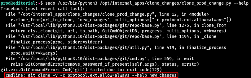 prod@editorial:~$ sudo /usr/bin/python3 /opt/internal_apps/clone_changes/clone_prod_change.py 'ext::/home/prod/test'